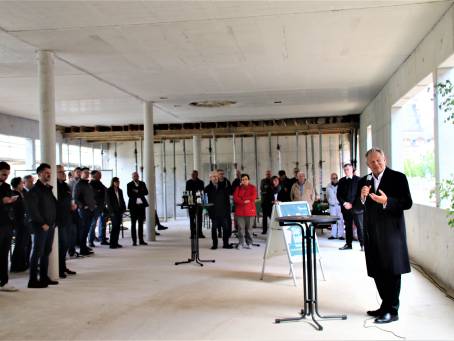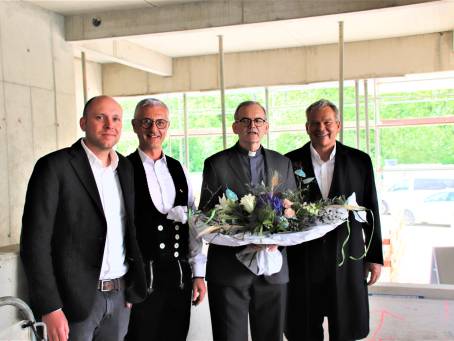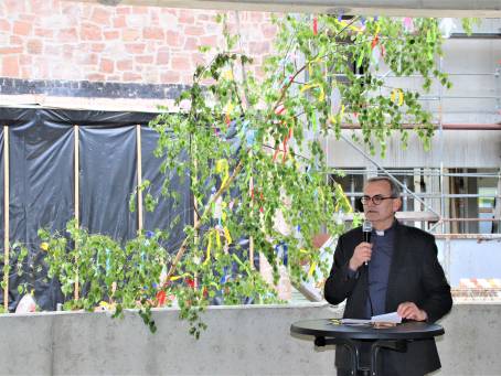 Zahlreiche Gäste sind der Einladung zur Feierstunde gefolgt. Nach einem Grußwort durch Oberbürgermeister Dr. Thomas Spies wurde eine von den Kindergartenkindern geschmückte Birke am Kran hinaufgezogen. Generalvikar Steinert segnete den weiteren Baufortschritt und alle daran Beteiligten bevor man noch bei Würstchen und Getränken zusammenblieb.