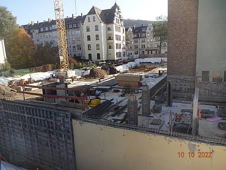 Die Arbeiten am Bau gehen weiter. Im Bereich der zukünftigen KHG stehen inzwischen die Außenwände des Kellergeschosses, auch die zukünftige Tiefgarage ist inzwischen betoniert. Am Holzzaun ist weitere Werbefläche für Unternehmen entstanden, die angemietet werden kann. Mehr Informationen finden sich hier.